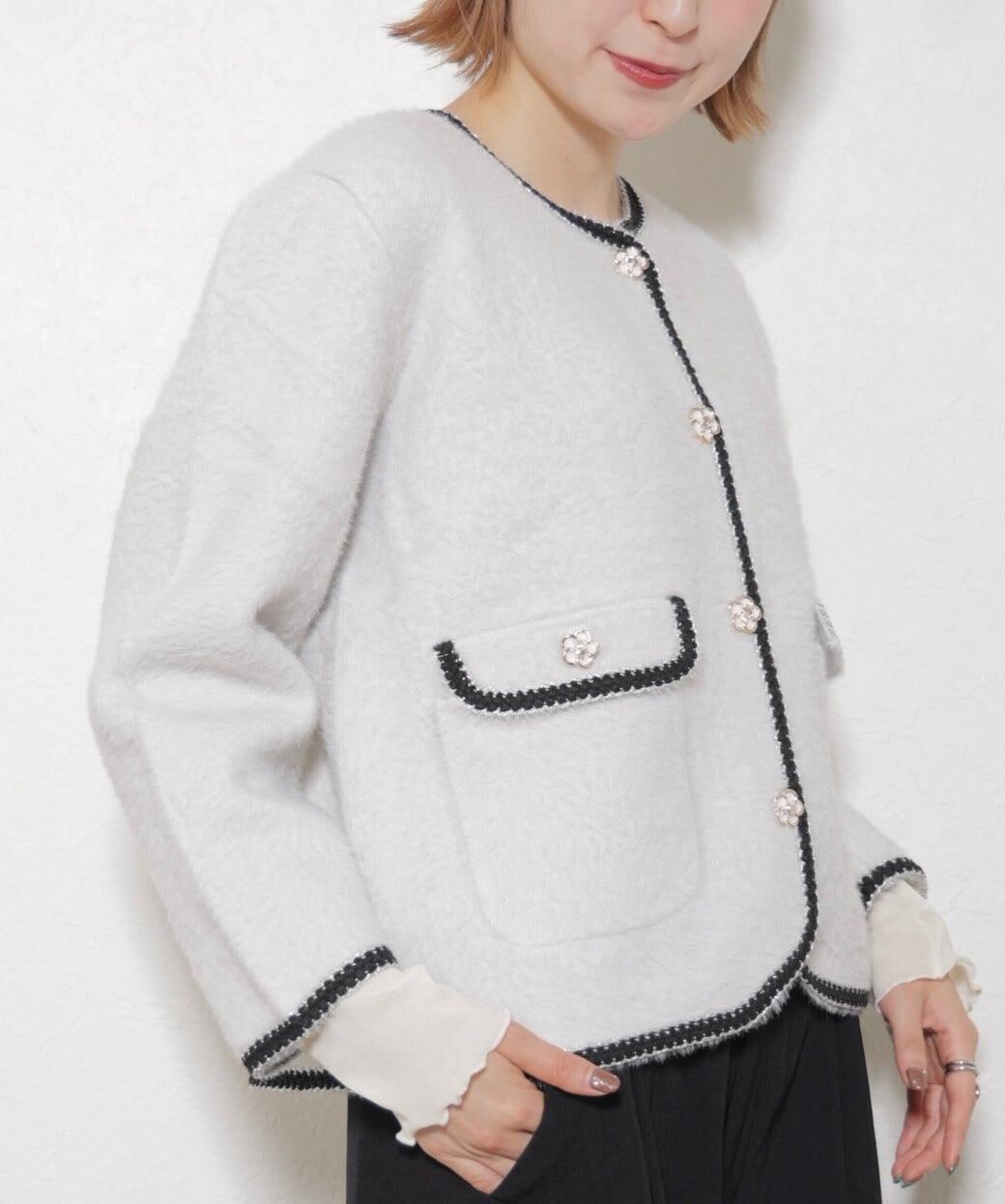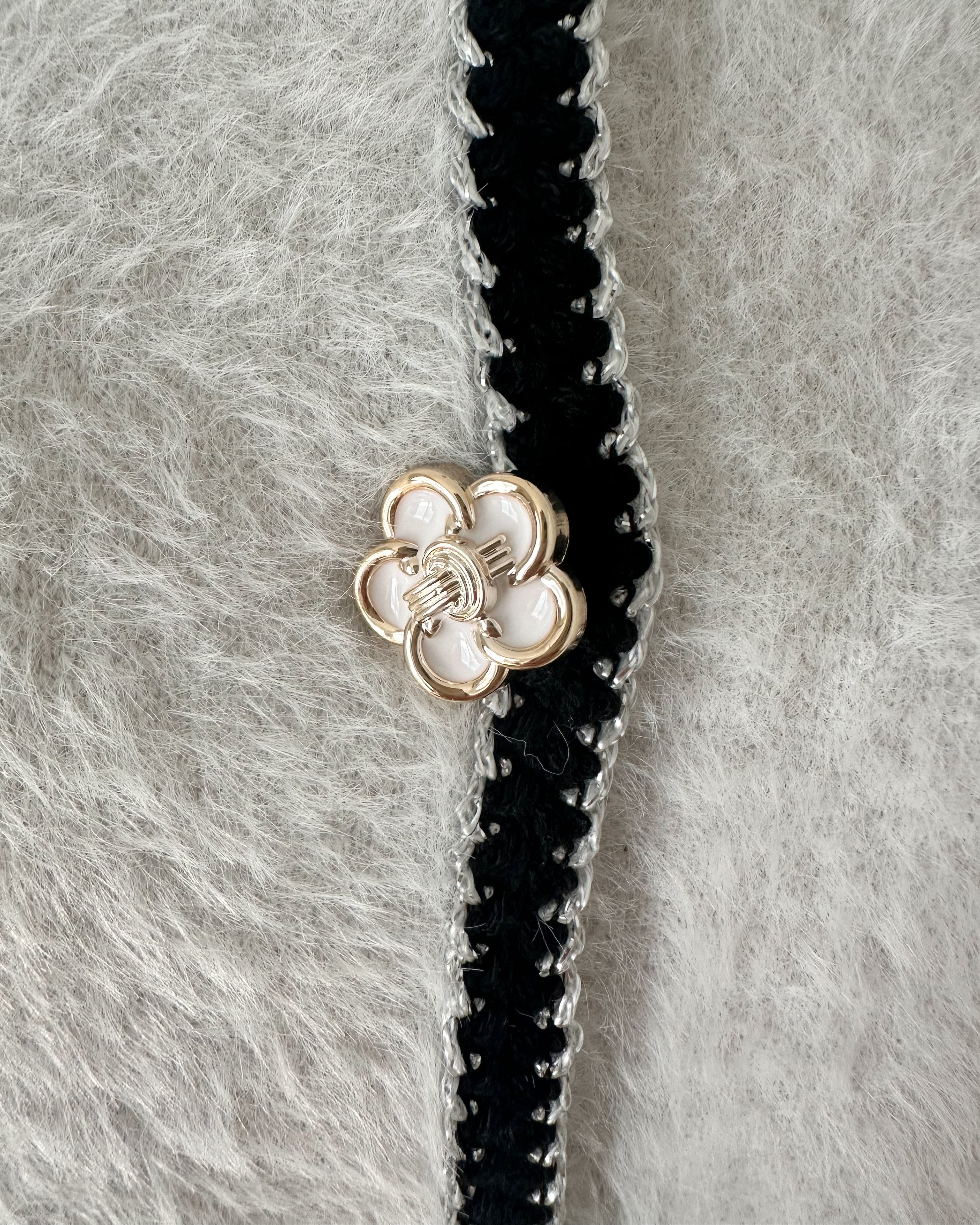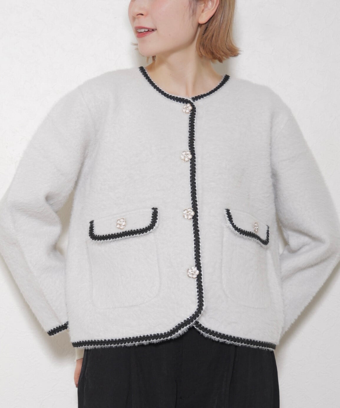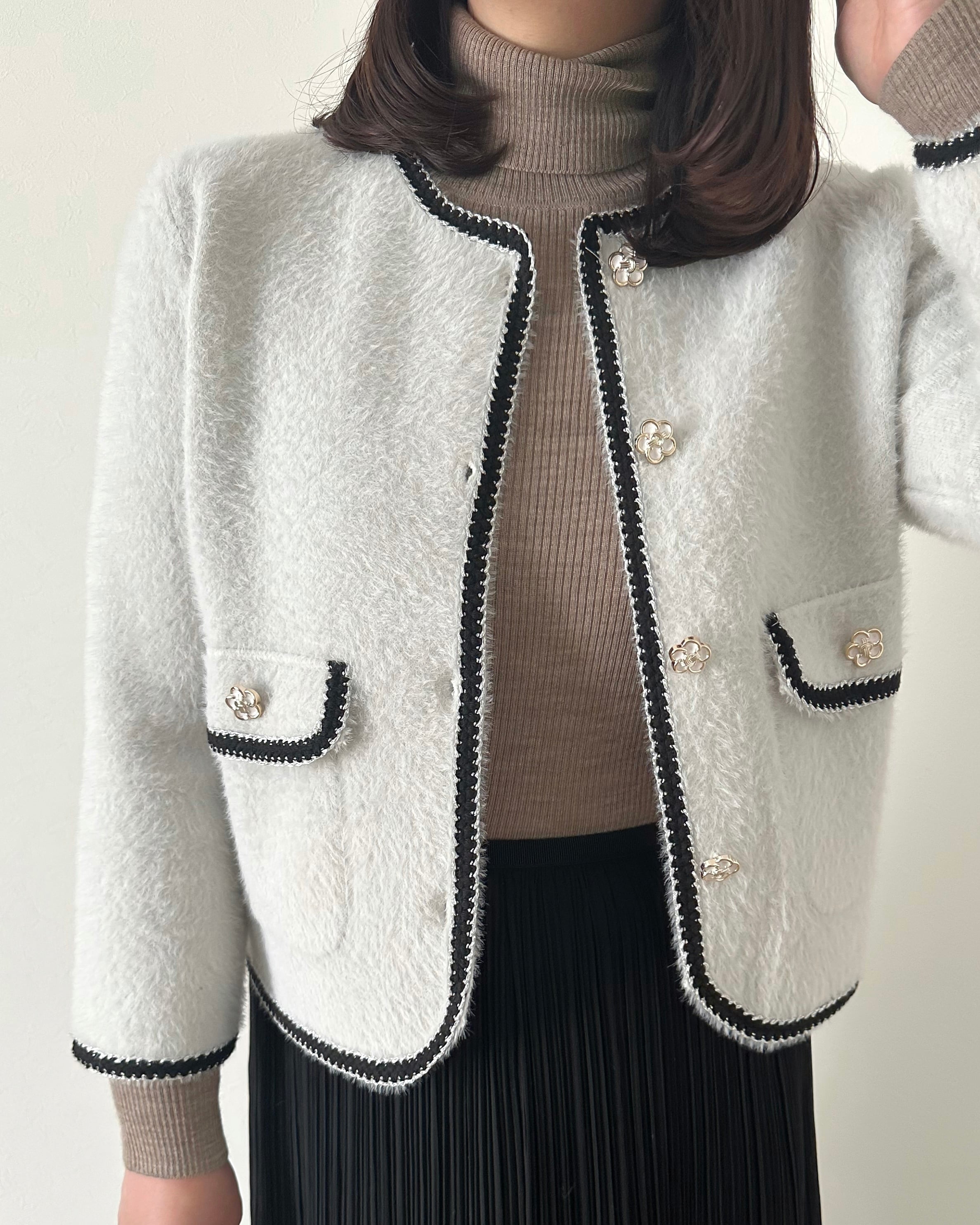 フラワーモチーフのゴールドボタンと配色ラインが、