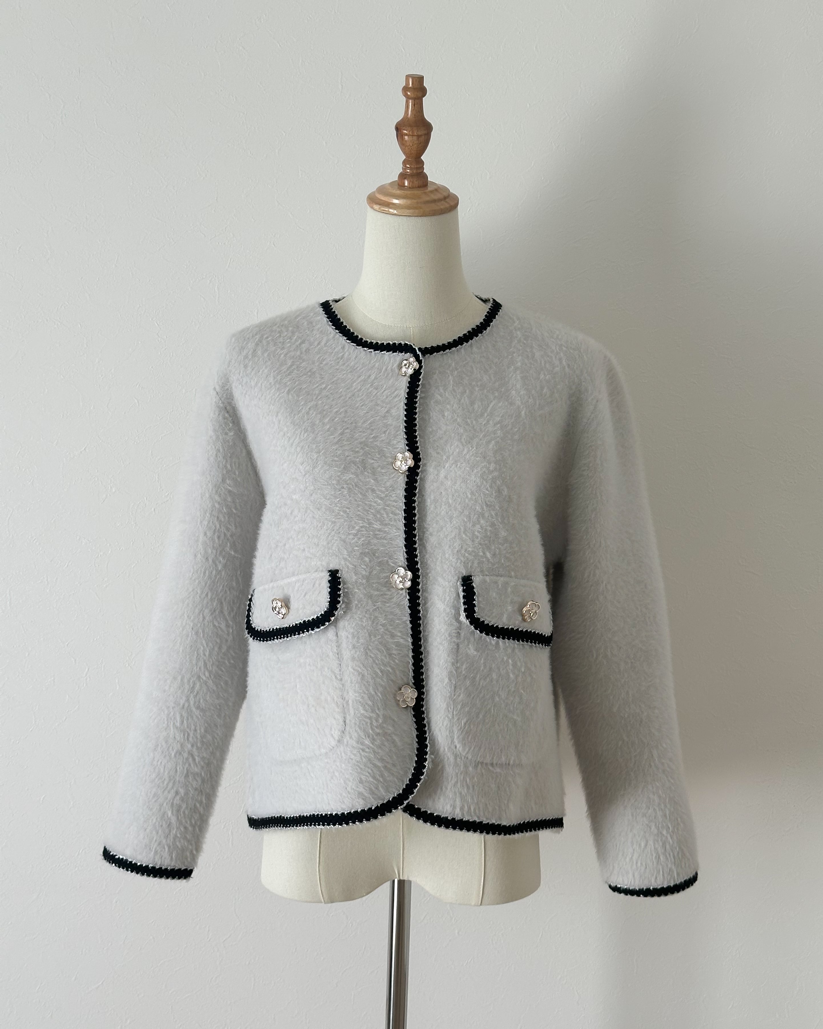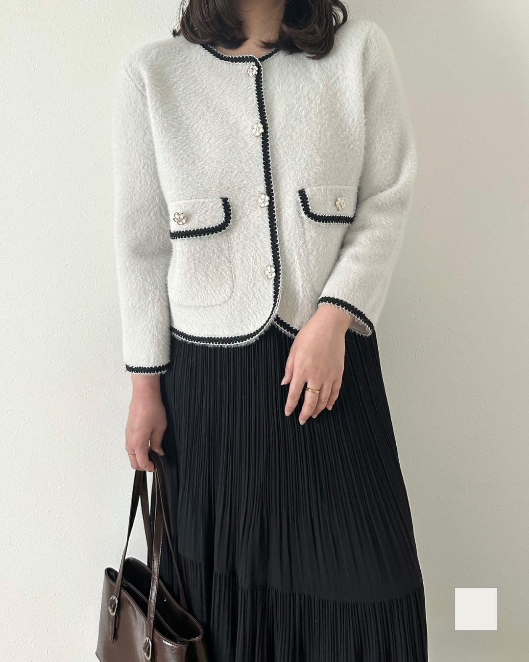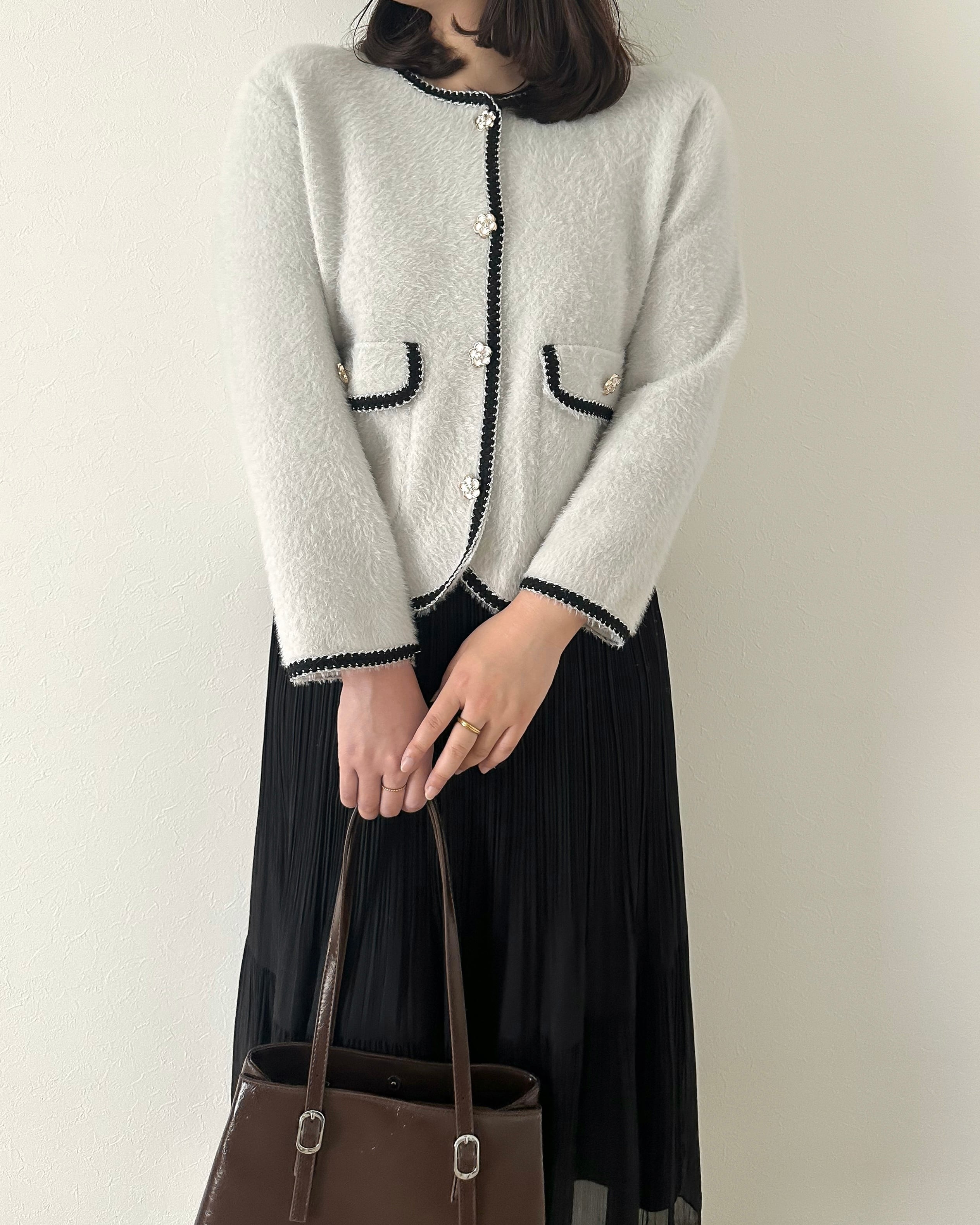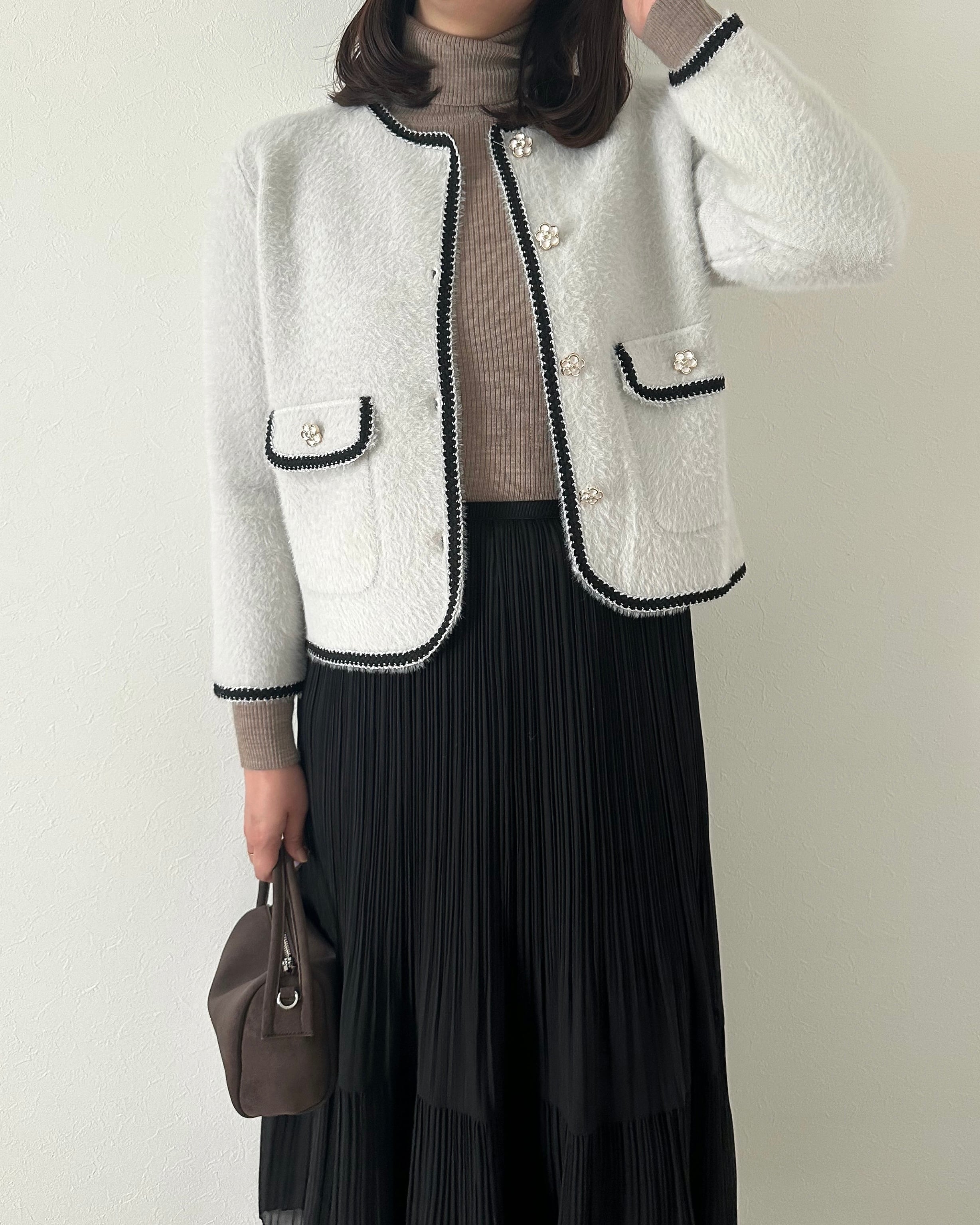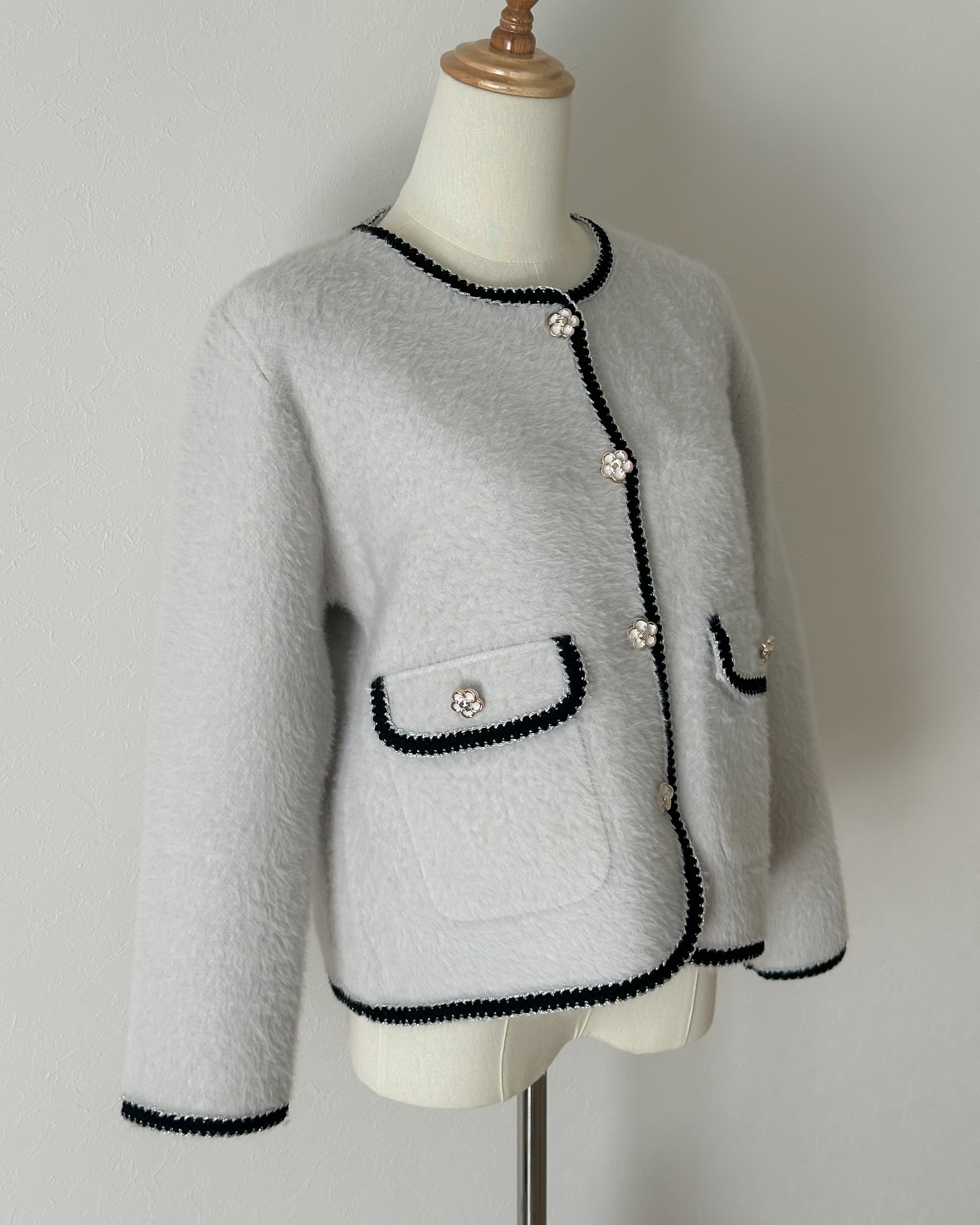 フラワーモチーフのゴールドボタンと配色ラインが、