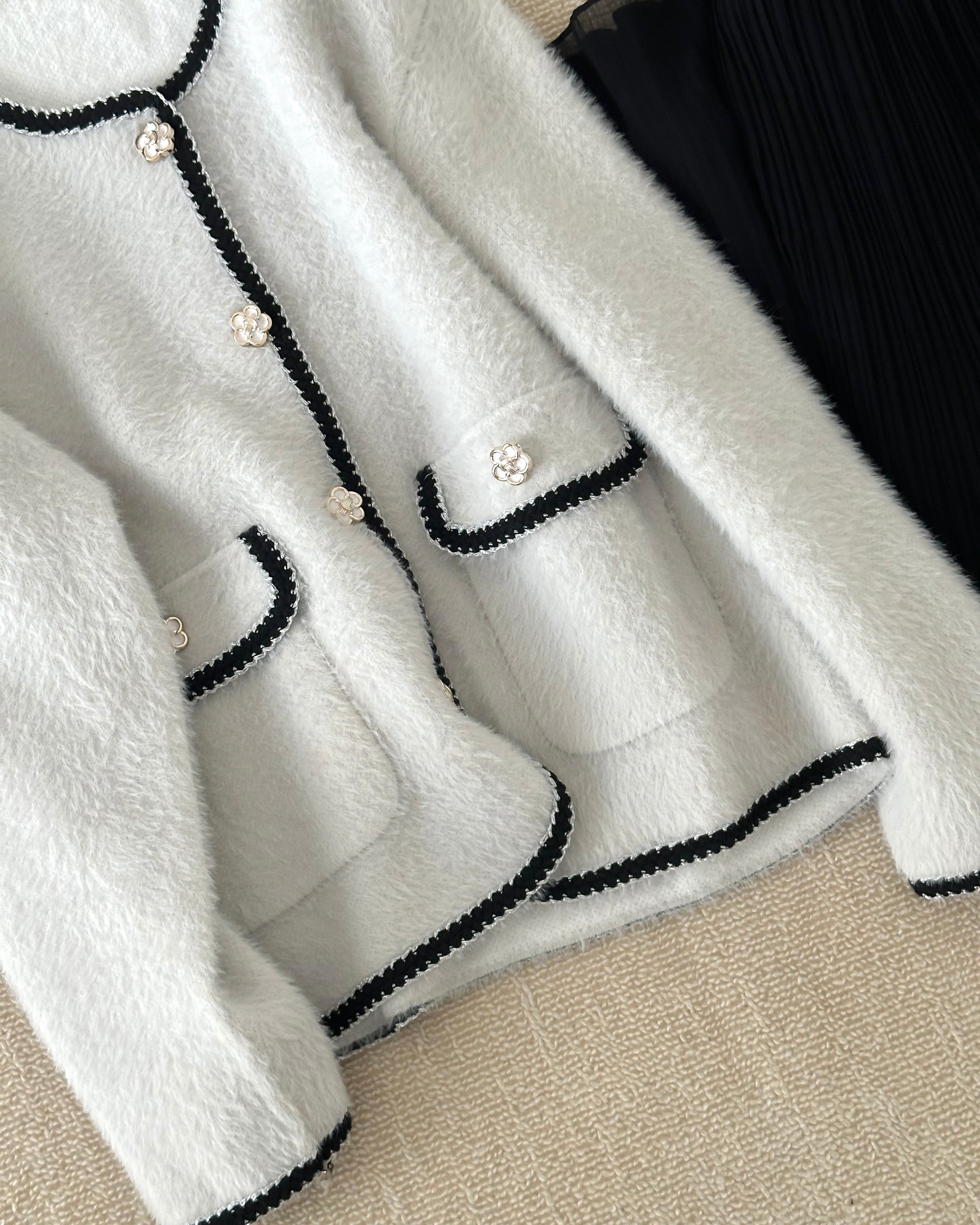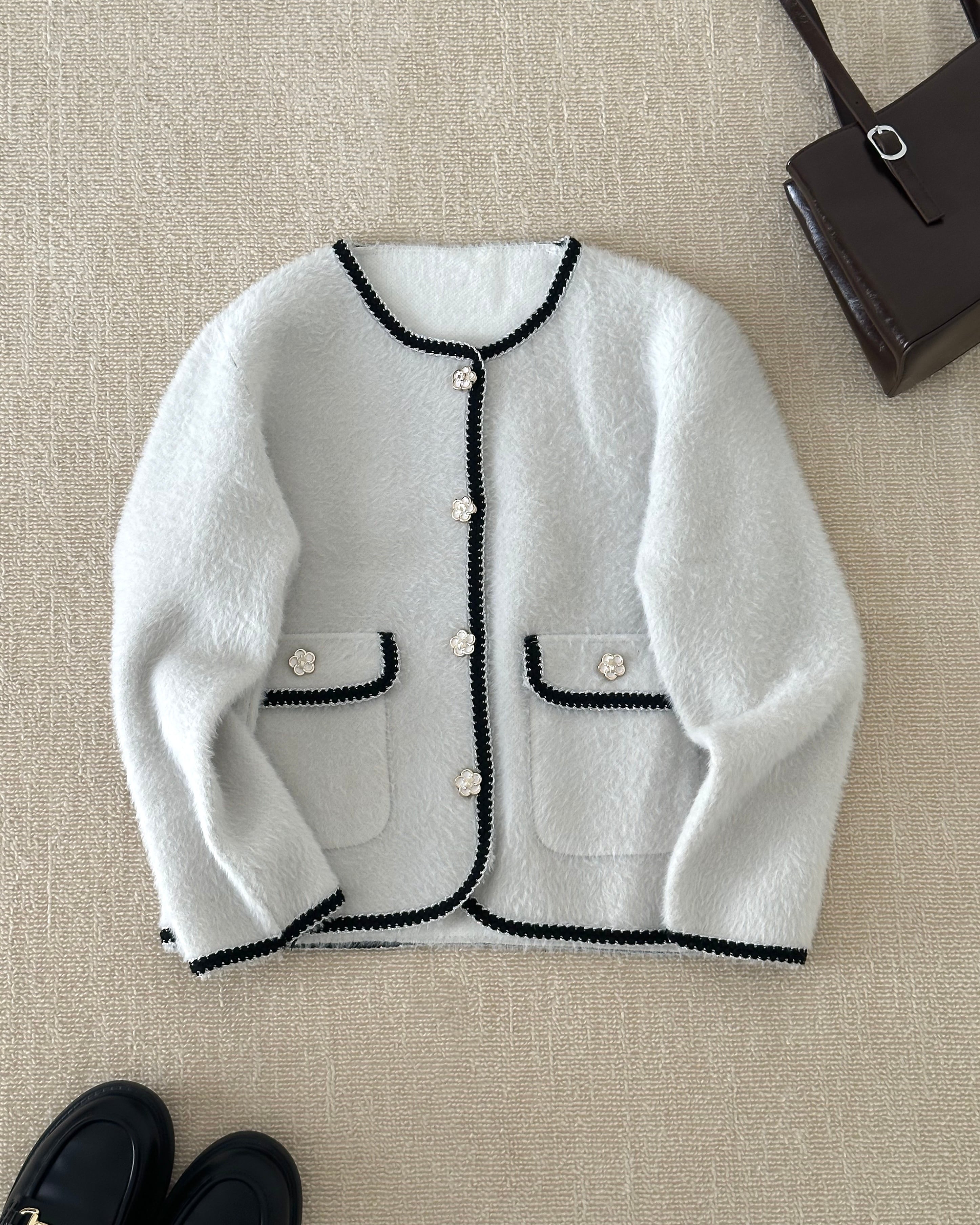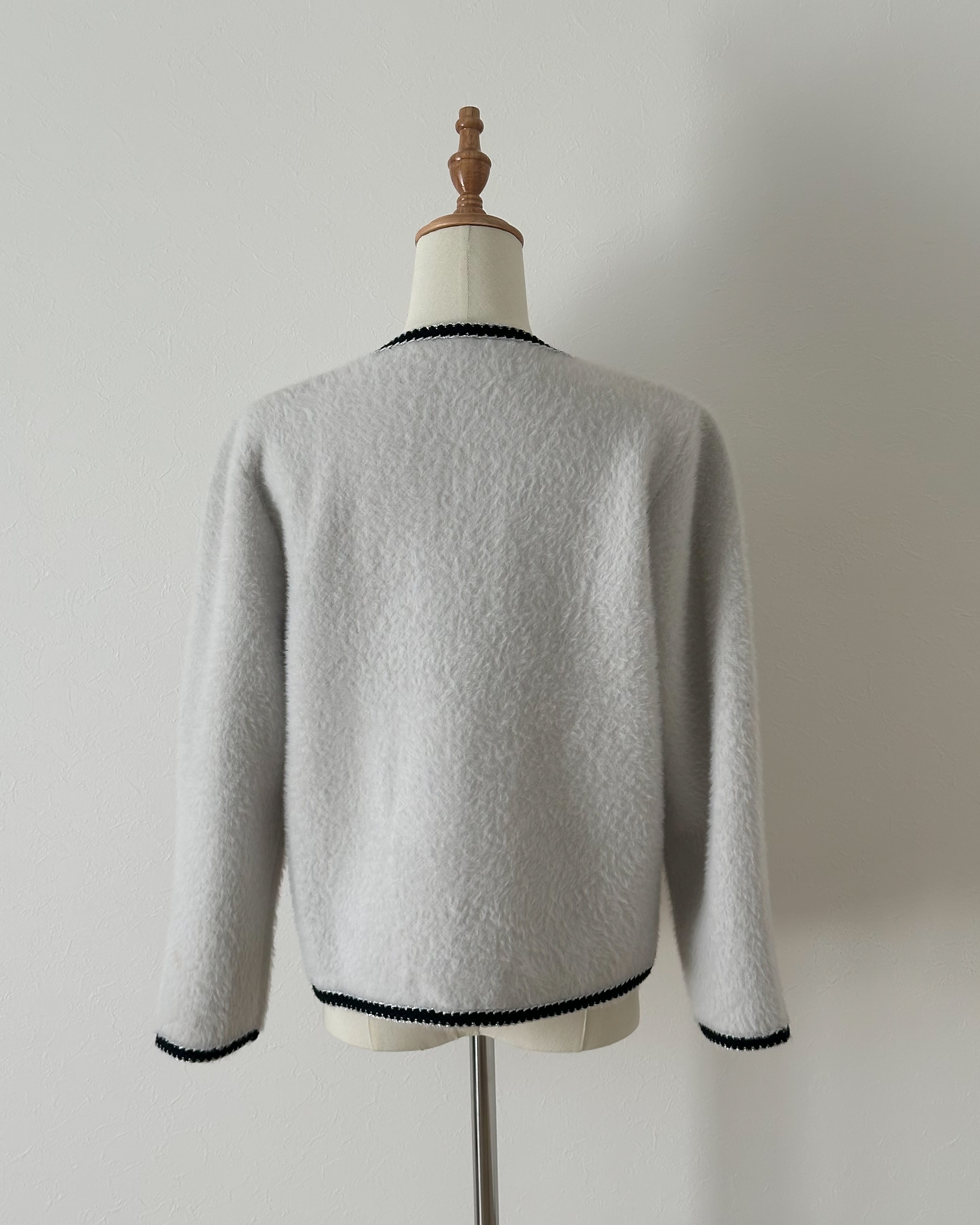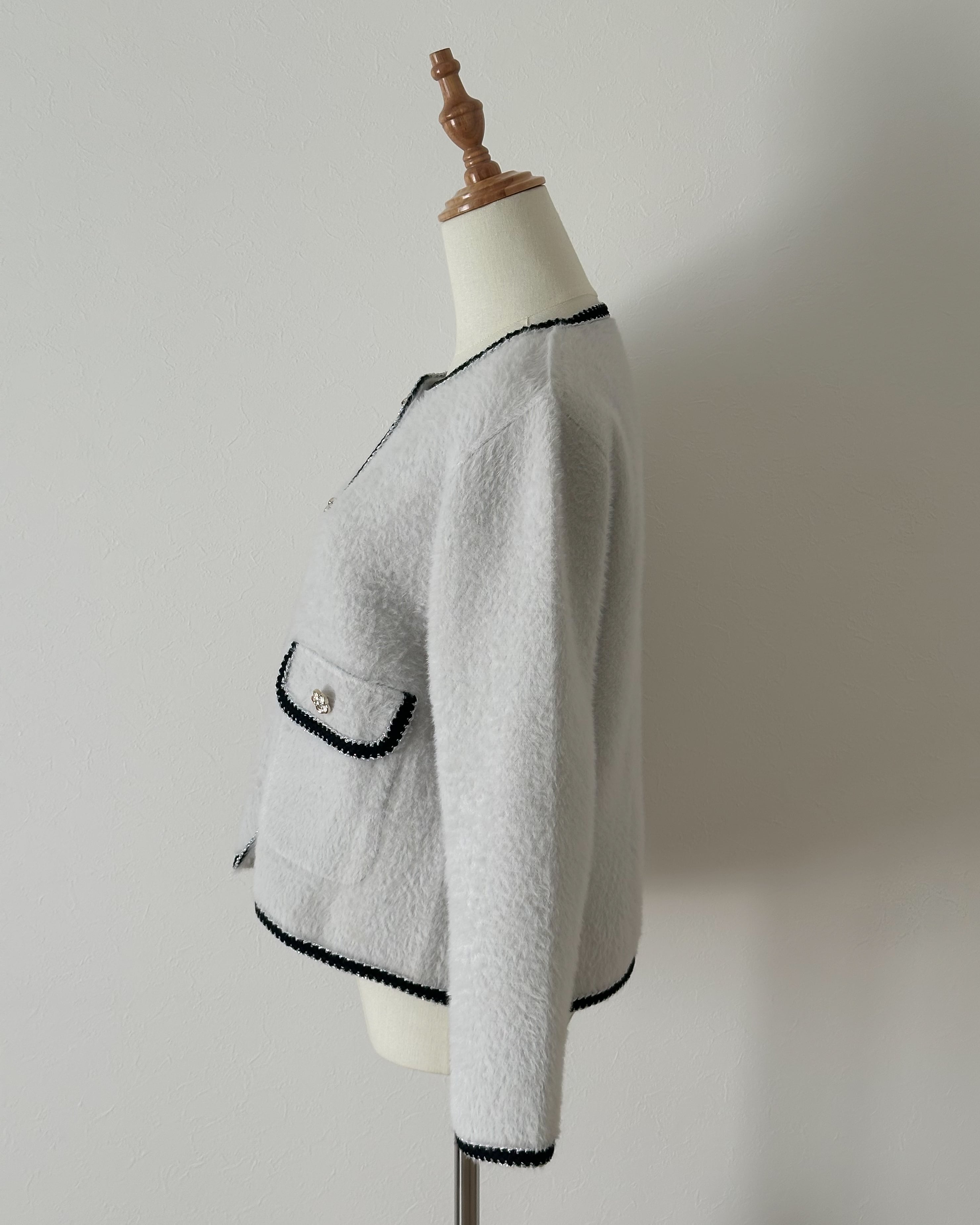 フラワーモチーフのゴールドボタンと配色ラインが、